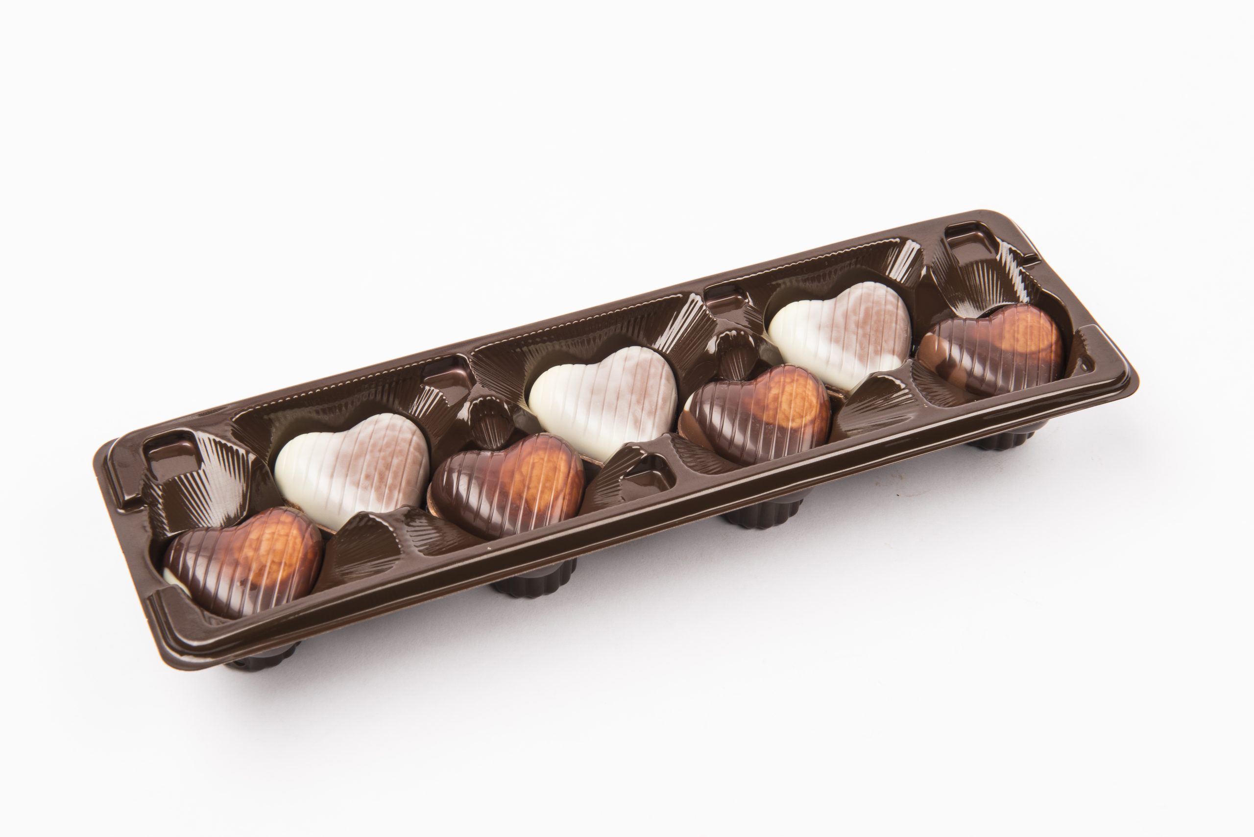 Finos bombones de Chocolate belga rellenos de exquisito praliné de cacao y avellanas, en forma de figuras de corazón sabor a brownie especiales para disfrutar y regalar a quien más quieras, Bélgica es famosa por fabricar los mejores chocolates del mundo, su única receta revela el sabor del chocolate al 100%.